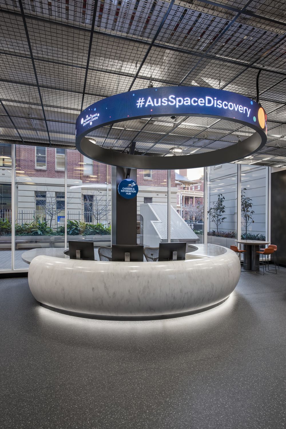 The Australian Space Discovery Centre, Lot Fourteen has received a Commercial award in the 2021 Corian Design Awards. Focusing on expressed materiality, the application of moulded and formed Corian has produced a seamless design that draws people to the centre of the careers hub. The use of Corian reflects earth, space, light and dark for the main touch point for customer service that creates a sculptural anchor and main feature within the heritage fabric of the McEwin Building.
