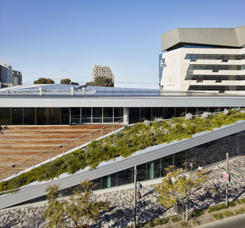 The 6th of June marks World Green Roof Day, so fittingly we are reflecting on the Green Wings of Pridham Hall, University of South Australia’s premier recreation and event facility. Folding to connect at street level, this innovative structure offers two externally accessible terrace spaces which ground the building and connect the architecture with the public realm and landscape. With a carefully selected planting palette that produces an exceptional year-round display of changing textures and colours, the Green Wings of Pridham Hall provide a lush mosaic of plants that complement the strong geometry of the architecture.