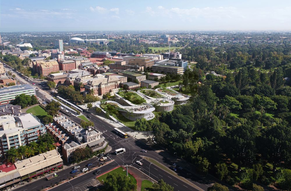 The Adelaide Contemporary seeks to reconsider the orthodoxy of how Australian art is curated and experienced through the juxtaposition of art produced contemporaneously across geographical and cultural boundaries. Appearing as an extension of the city to the west and pavilions in a garden to the east, the Contemporary will enlarge both public realm and the Botanic Garden, experienced in the ebbs and flows of hard- and soft-scape on its rooftops. To the north it gently steps down in transition to the gardens and the Palm House. On North Terrace it will establish a respectful yet iconic presence with a public plaza and expanded entrance to the Botanic Garden. The Adelaide Contemporary is a new breed of architecture as social infrastructure and culture bearer across boundaries.