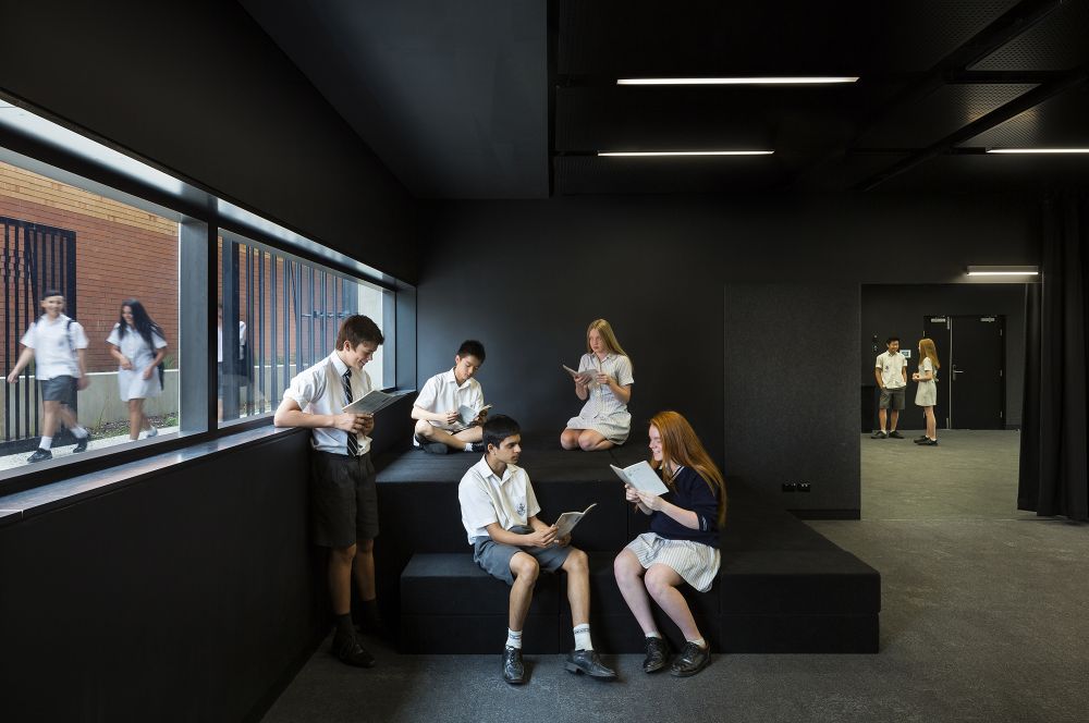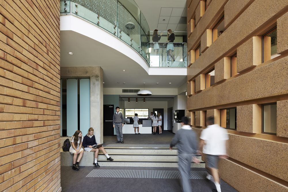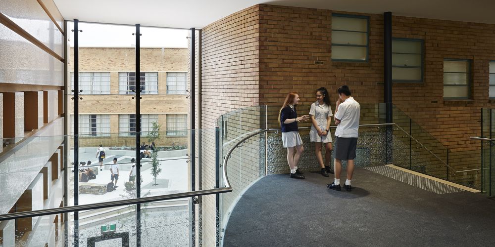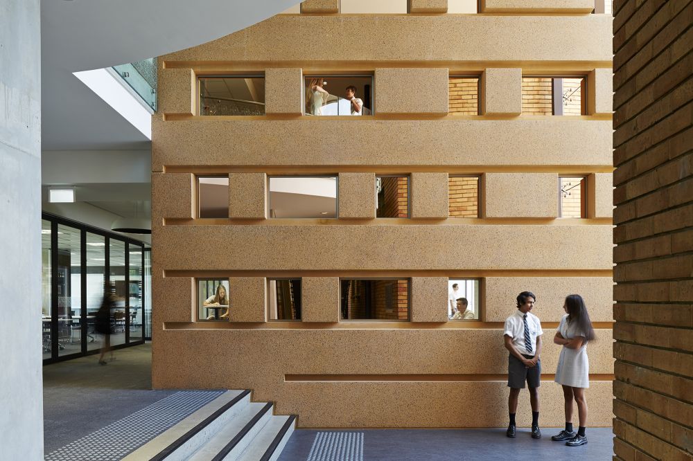 Learning, display, intimacy and social opportunity is created in every possible space. Back drops of polished precast concrete wrap from outside to inside to form a clear distinction between the heritage and the new ,with a circulation stair and double height glass void designed to open up to the student plaza and create a sense of scale. Park land views and heritage walls frame the new spaces to establish a sense of place and belonging.