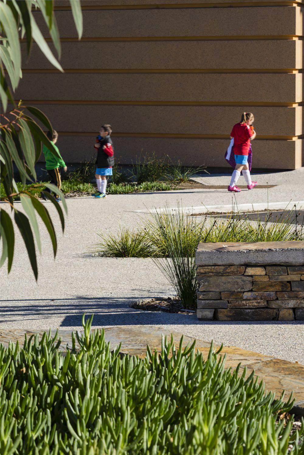 With the State Heritage building’s unique location the landscape design had an important role to integrate the new learning wing and basement car park into Park Land. Natural forms and planting create pathways and places to sit adjacent playing fields, creating gentle falls and disguising the entry to the new car park.