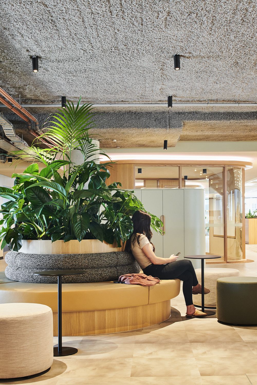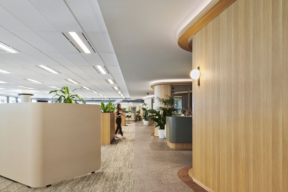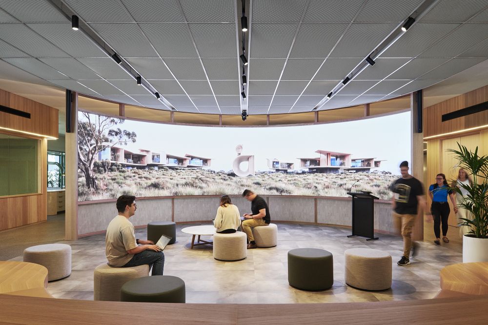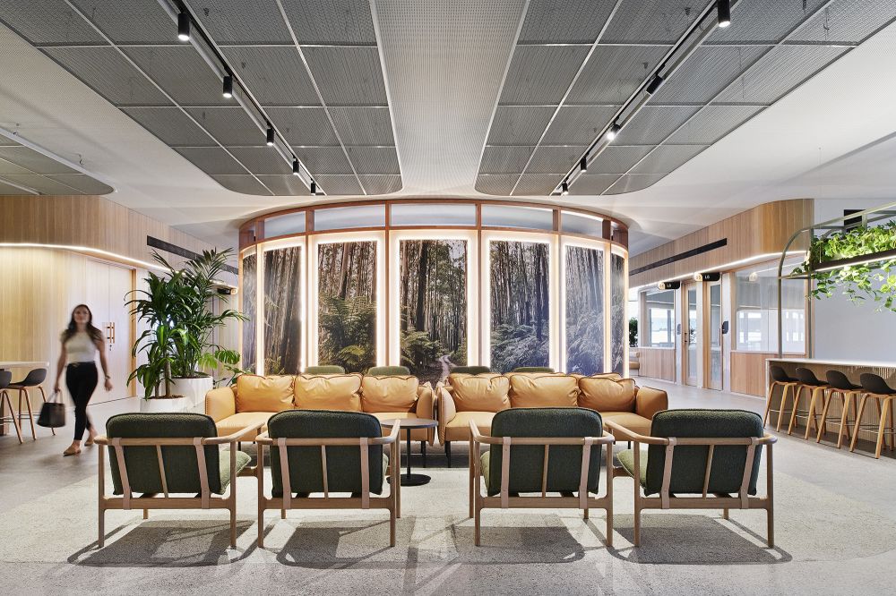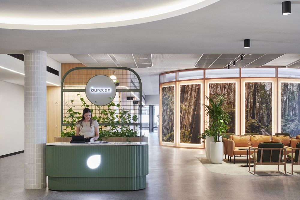 The fitout also draws inspiration from biophilic themes, incorporating organic forms, curved edges, and natural materials which align with Aurecon’s purpose and help soften the space to create a more welcoming and soothing atmosphere. The seamless integration of technology was a key driver for the design and helps enable digital ways of working. The new ‘Presentation Zone’ is a feature of the workplace, including a 10.3-metre curved screen and tiered seating which creates valuable space for Ted-Talk style presentations, large meetings, workshops and collaboration.