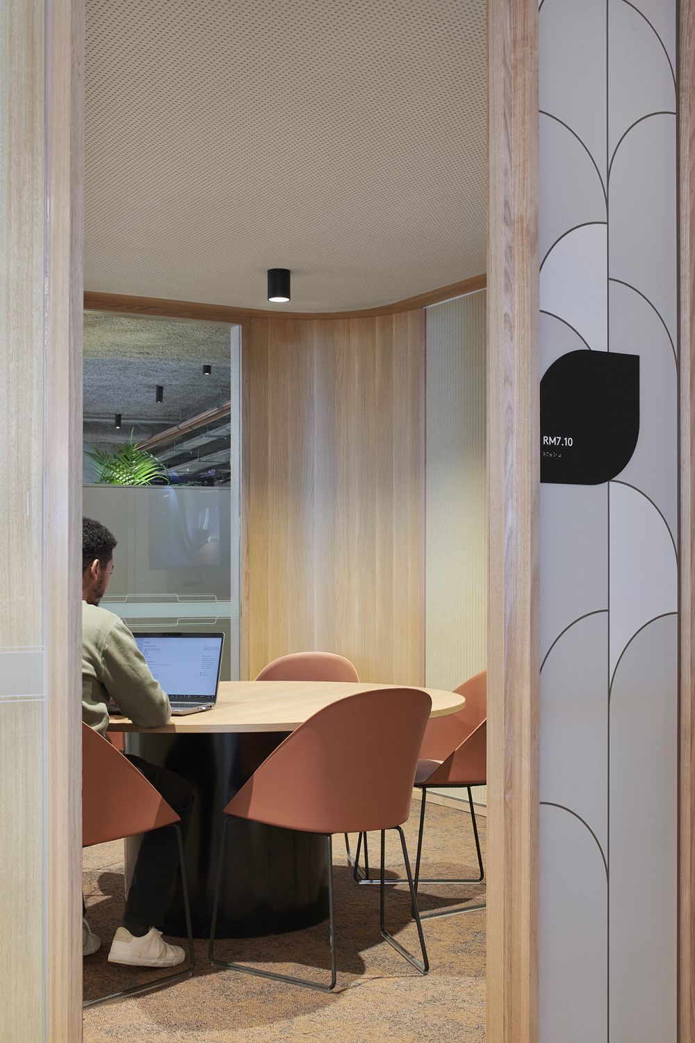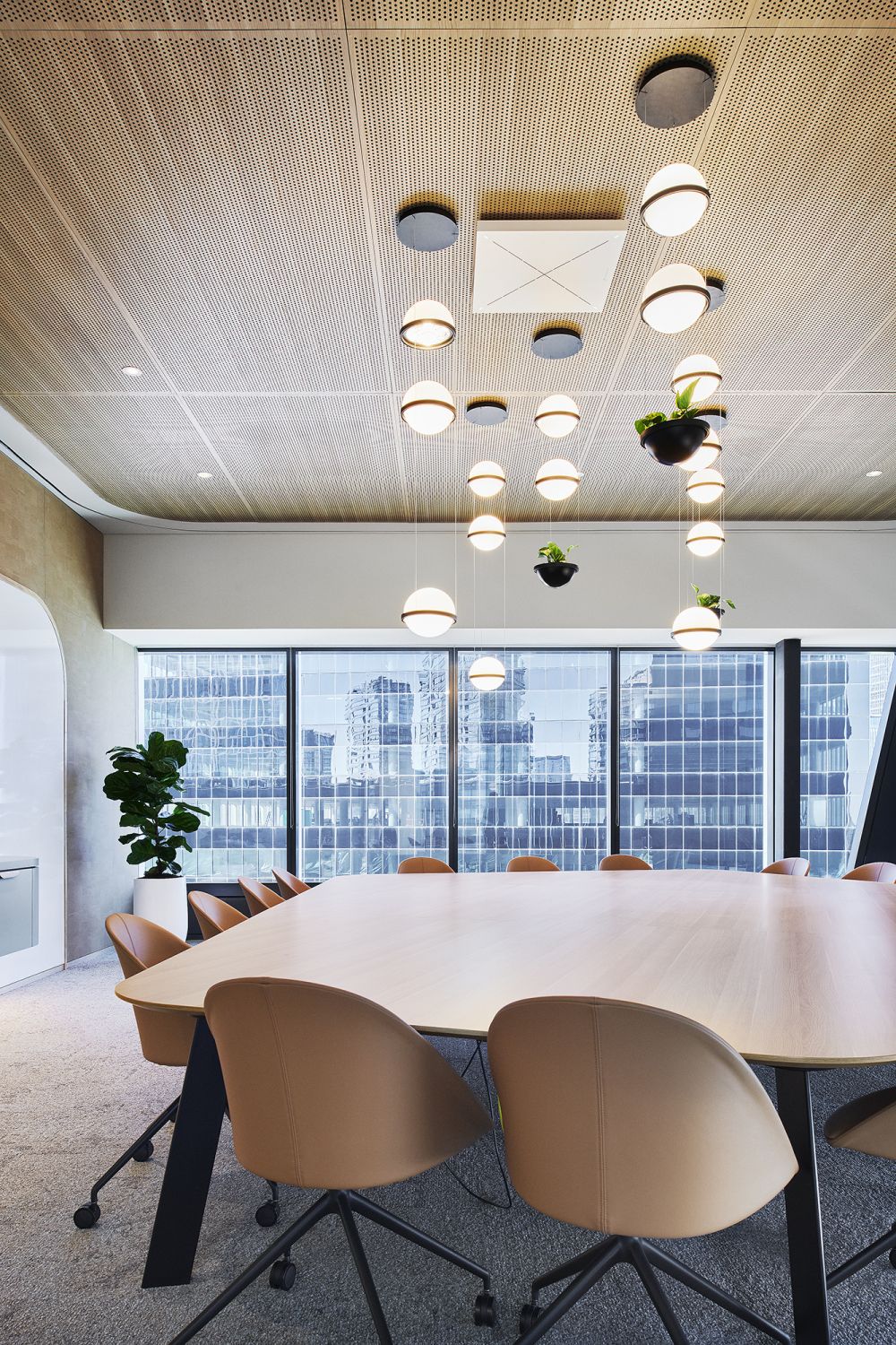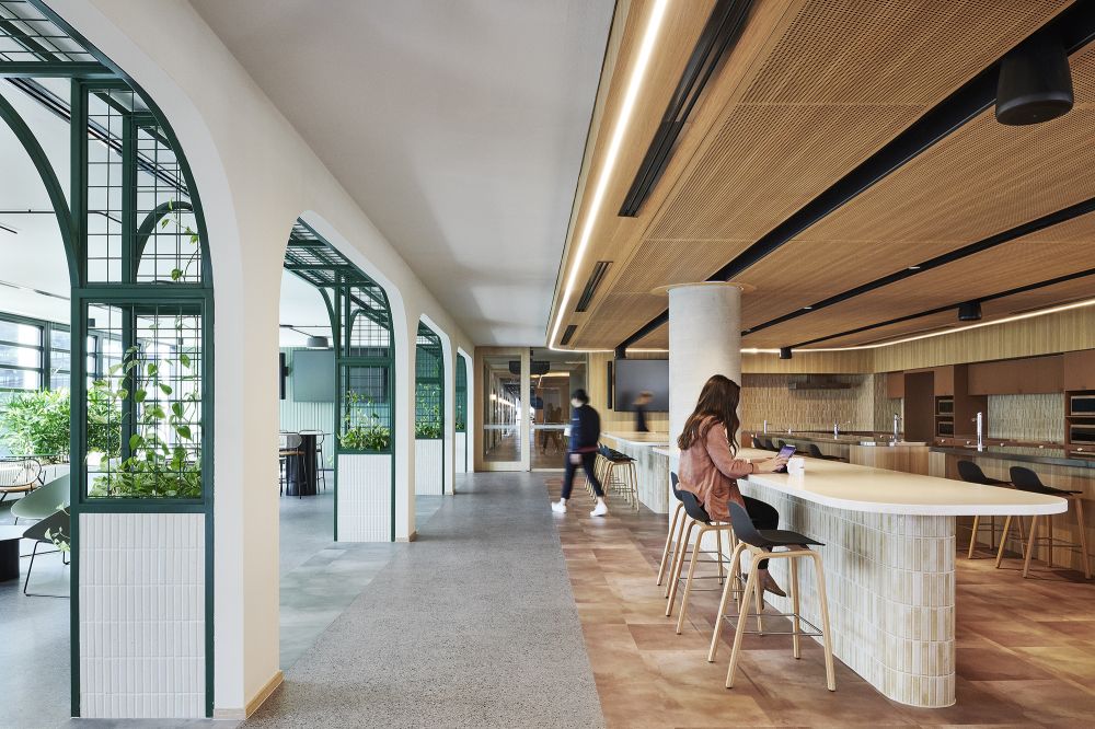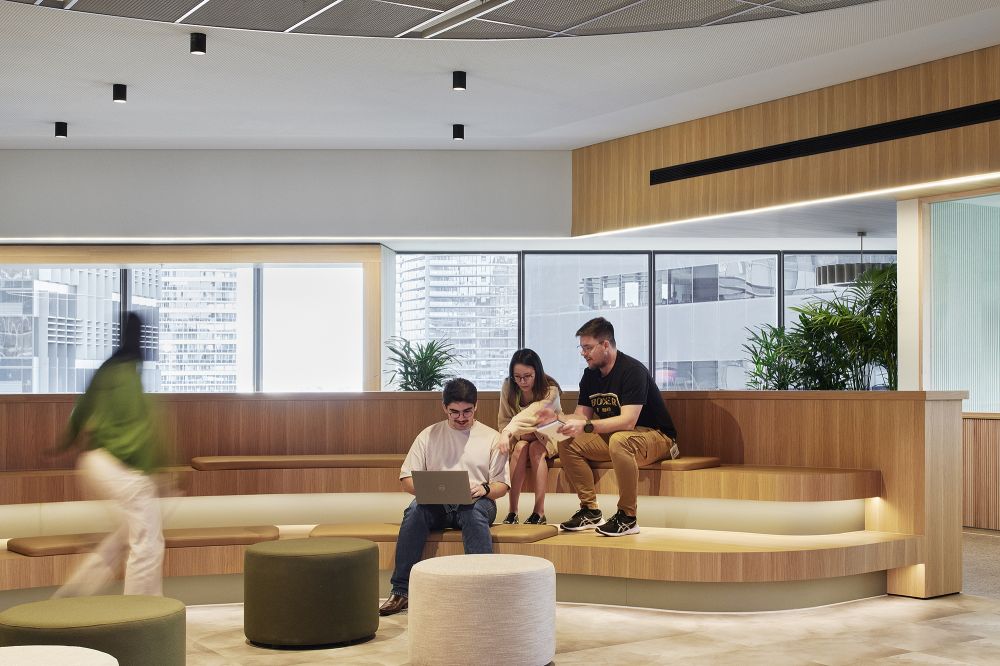 The fitout also draws inspiration from biophilic themes, incorporating organic forms, curved edges, and natural materials which align with Aurecon’s purpose and help soften the space to create a more welcoming and soothing atmosphere. The seamless integration of technology was a key driver for the design and helps enable digital ways of working. The new ‘Presentation Zone’ is a feature of the workplace, including a 10.3-metre curved screen and tiered seating which creates valuable space for Ted-Talk style presentations, large meetings, workshops and collaboration.