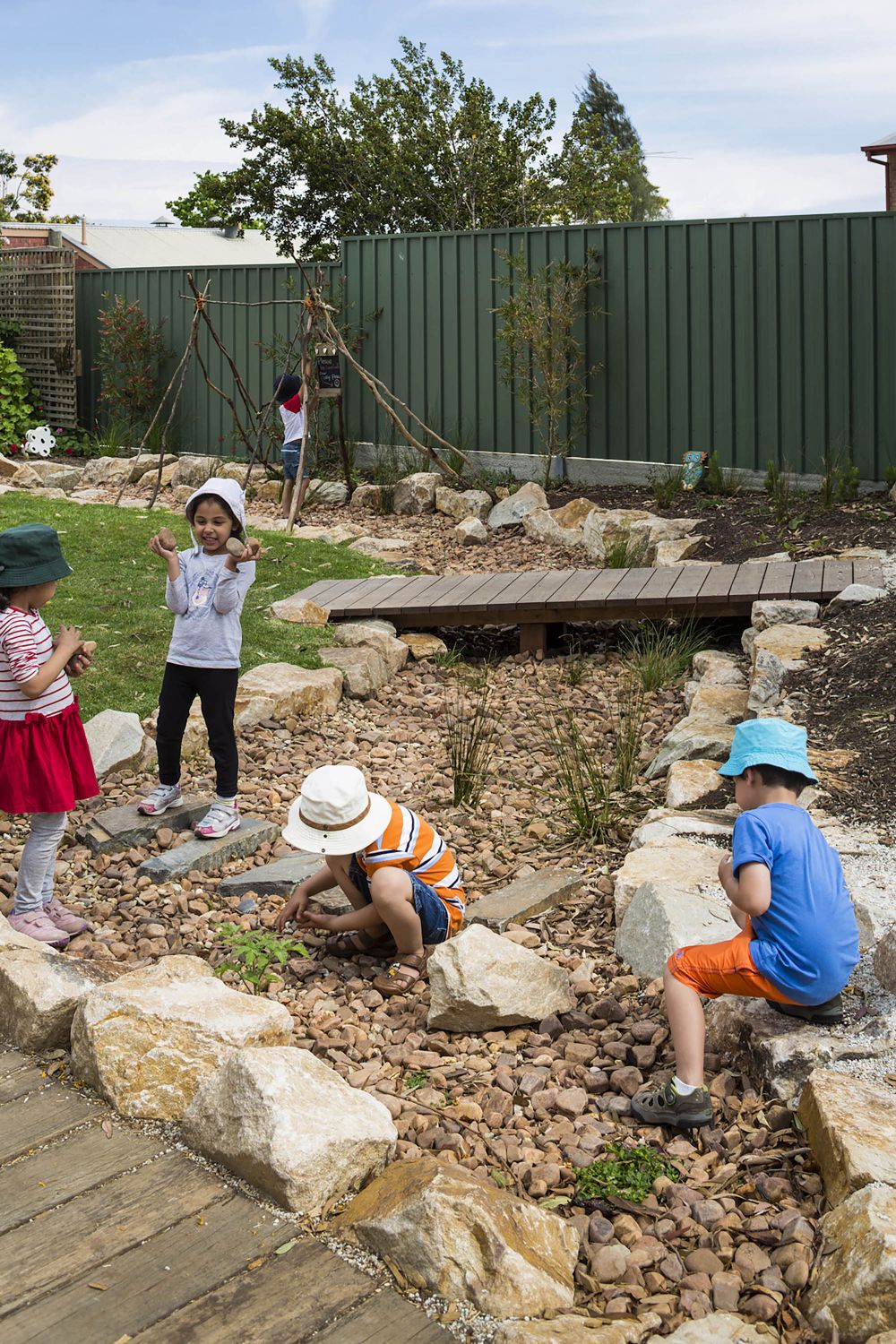 The creek forms a main pathway which connects the outdoor learning zones with the school entrance as well as branching to create a true dry creek bed, terminating at the sand pit. The outdoor learning space provides an extension to the internal learning spaces, and provides opportunity for open ended play and exploration. The outdoor space provides multiple opportunities for children to express and challenge themselves. The inclusion of a pizza oven extends beyond the preschool and opens the outdoor space to allow the community and families to gather.
