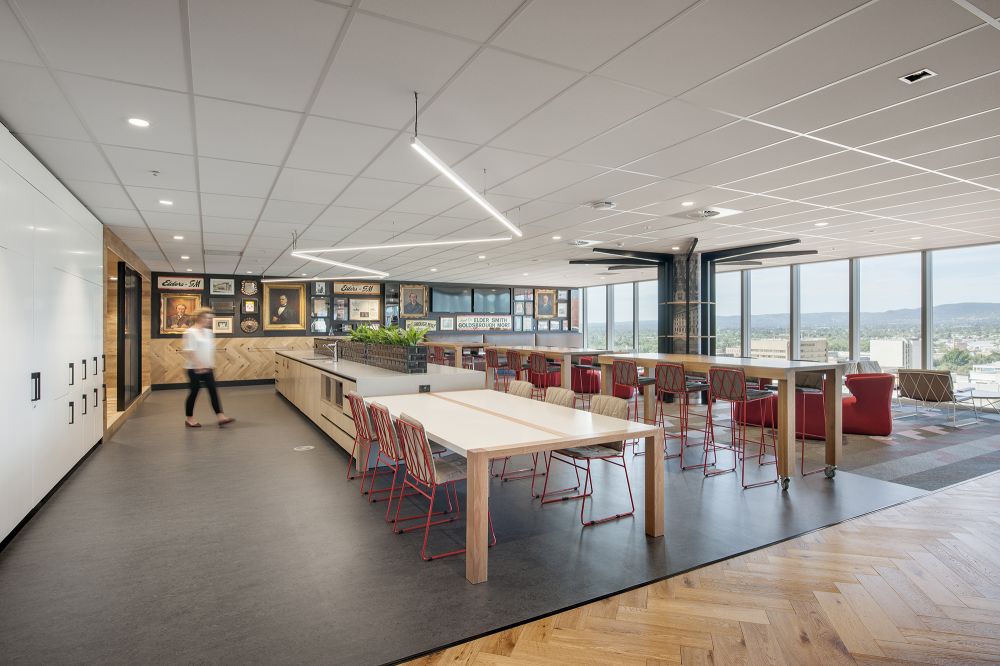 Iconic South Australian company Elders' new Adelaide office fitout accommodates around 200 staff. The design is an expression of the company’s core philosophy and business. Materiality and layout seek to express a connection to the land and expansive history of the company, balanced with a forward-looking attitude. JPE worked closely with Elders to deliver a new fitout which excites and inspires staff, improves their wellbeing, and reinvigorates the organisation and its brand.