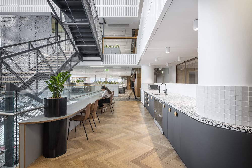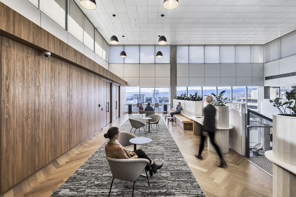 This tailored environment has functionality, flexibility and wellbeing at the forefront, incorporating a diverse range of environments including breakout spaces and a winter garden for socialising and building workplace culture. Custom joinery, natural light and stunning city views all contribute to providing the contemporary infrastructure required to support a healthy, productive and vibrant workplace that responds to the user experience.
