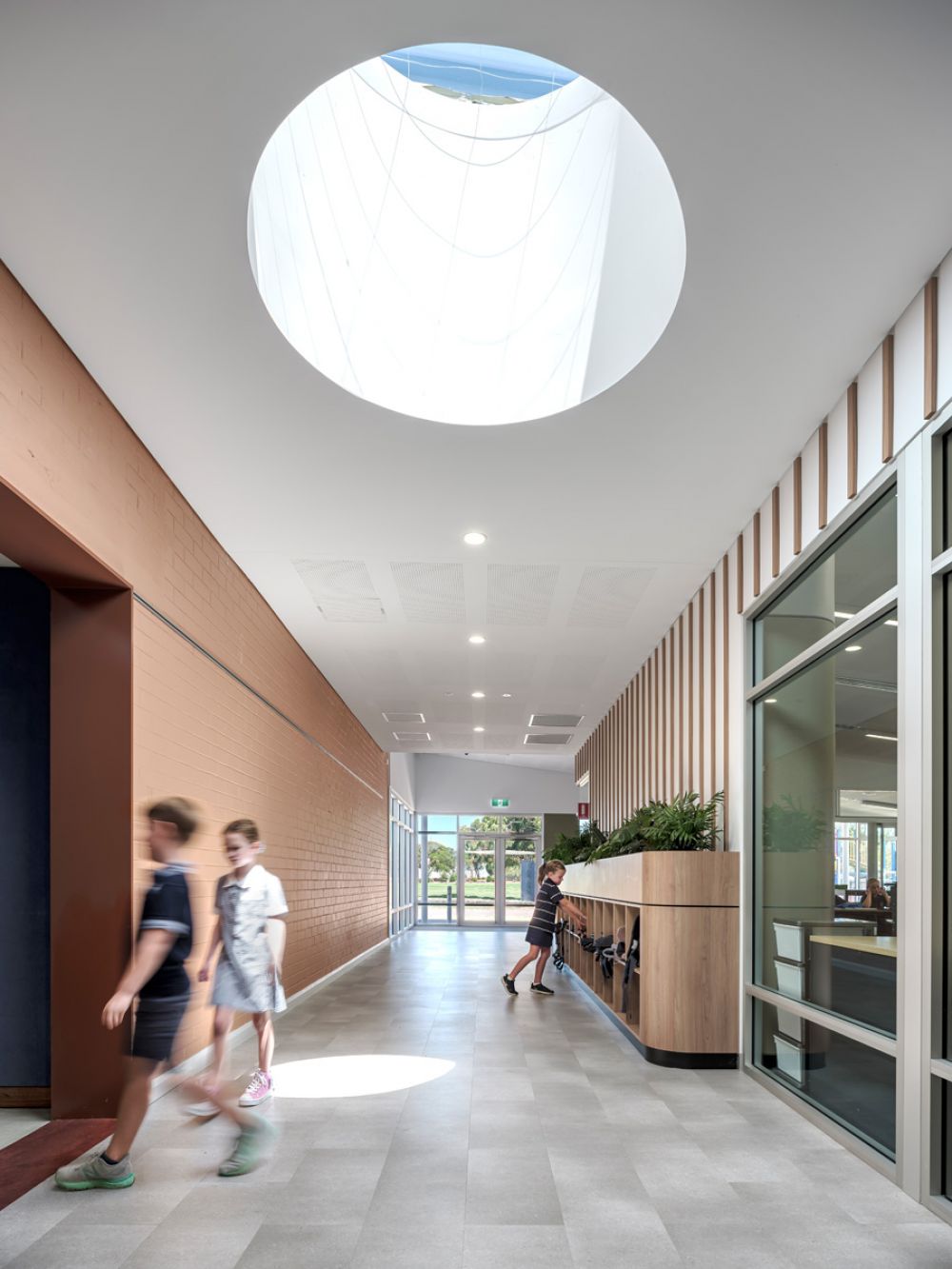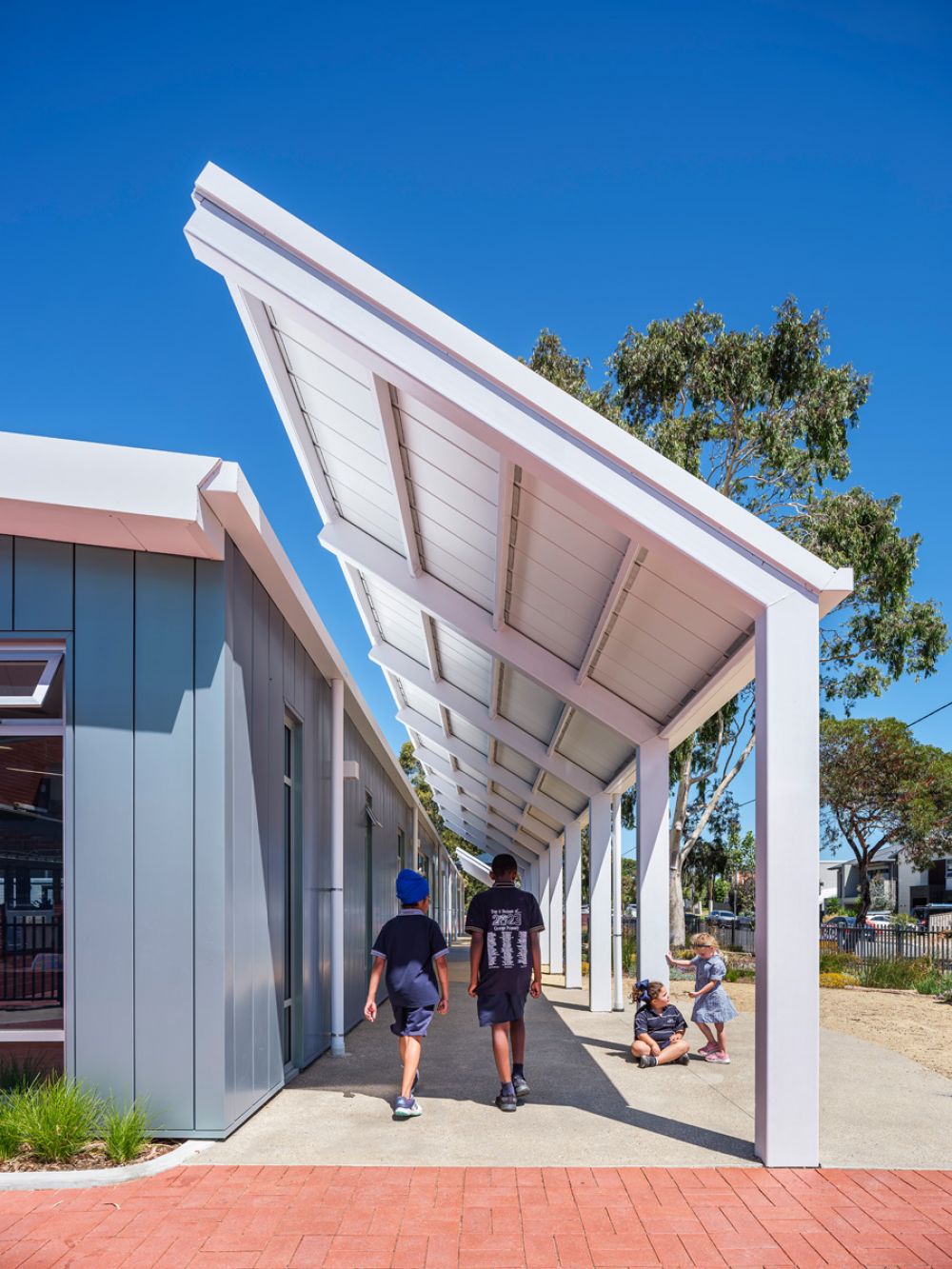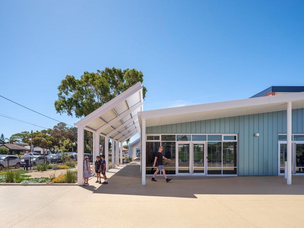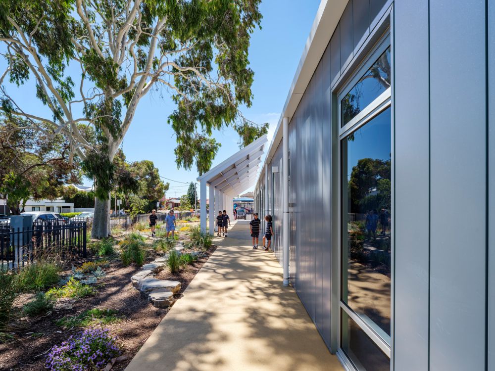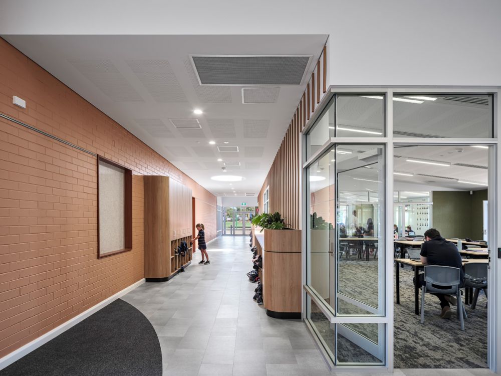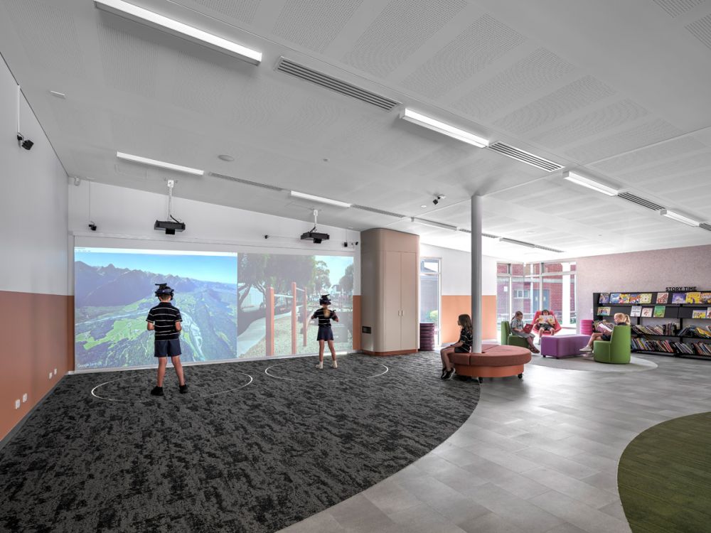 The design for Grange Primary School responds to what was once an ephemeral wetland, reflecting the context to the coast and the existing landscape. Contemporary learning environments are encapsulated within this new building envelop and have been designed with agile learning, integrated technology and a greater connection to the outdoors as a core focus. The new Primary School building consists of 3 classrooms, 2 breakout spaces, a learning lab with library and a VR zone, a teacher prep area and additional storage. These spaces are visually and physically connected through glazed partitions and large sliding doors, creating a ‘learning street’ that can connect for collaborative and shared learning experiences, as well as future flexibility. The joinery, furniture and floor finishes create ‘ponds’ of activity, each with a different function varying from active and vibrant spaces to more reflective and quiet spaces. The design of both the built form and landscape focus on permeability, flow, experience, and connectivity of all parts. The planting palette includes plants indigenous to the area and those suitable for the coastal environment while also providing seasonal interest and sensory engagement.