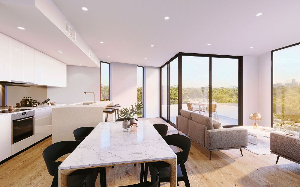 The facade of the residential form explores the synthesis between external expression and internal program, and uses the Park Lands context as an opportunity to explore the notion of framed views - framing the view out, but also the view in. The proposed apartments have been designed to reflect the needs of the target market, and incorporate high levels of natural daylight, natural ventilation, functional terraces and balconies and high quality open plan living spaces. An integrated community landscape approach to the entire site has been adopted, including the re-establishing of a wrapping garden treatment to the former St Margarets Residence along the Greenhill Rd and George St frontages.