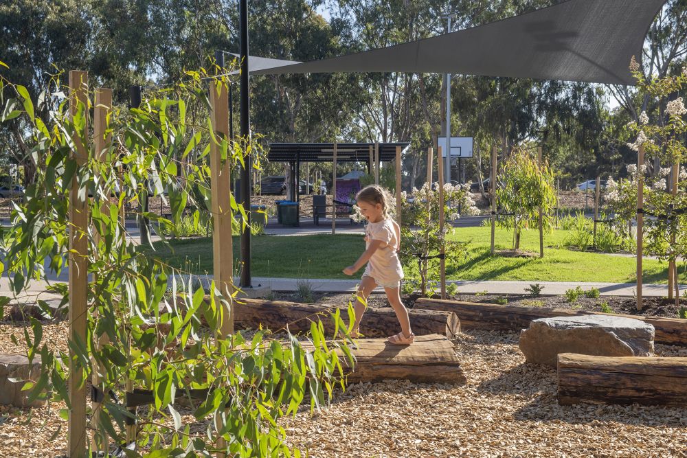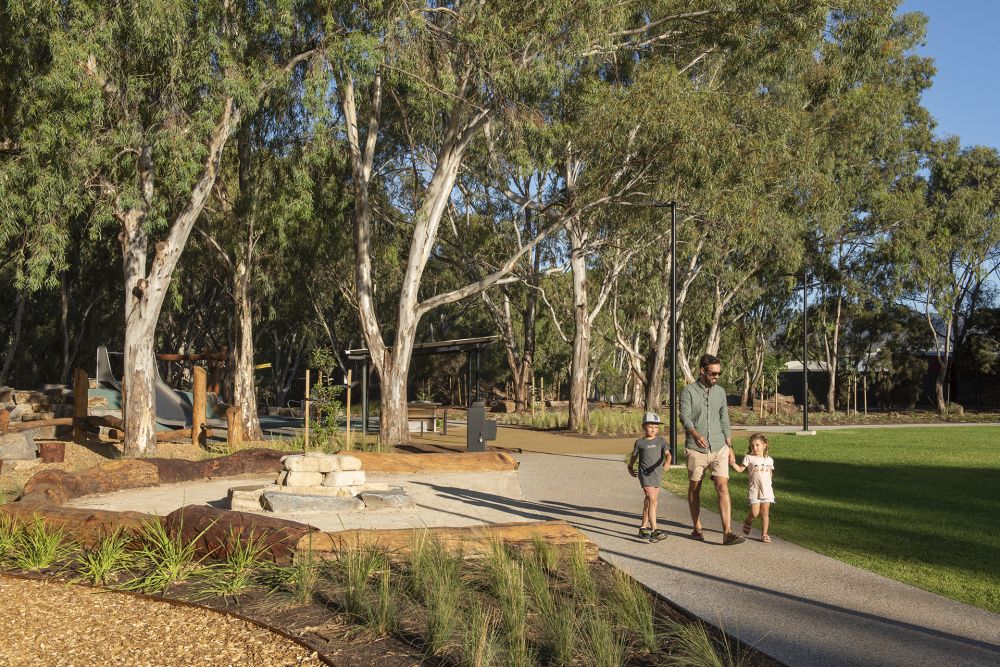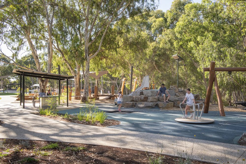 The new central plaza provides opportunities for outdoor events, with power outlets provided within the plaza and lighting upgrade throughout to promote safe use in the evenings. The use of rocks is a consistent design theme in the design, which has been woven throughout to tie all the spaces together and contribute to creating a common identity. Accessibility has been improved across the site, with the inclusion of accessible play elements and a new DDA compliant path which unfolds throughout the site and connects Darley Road with Karrawirra Parri (River Torrens Linear Park).