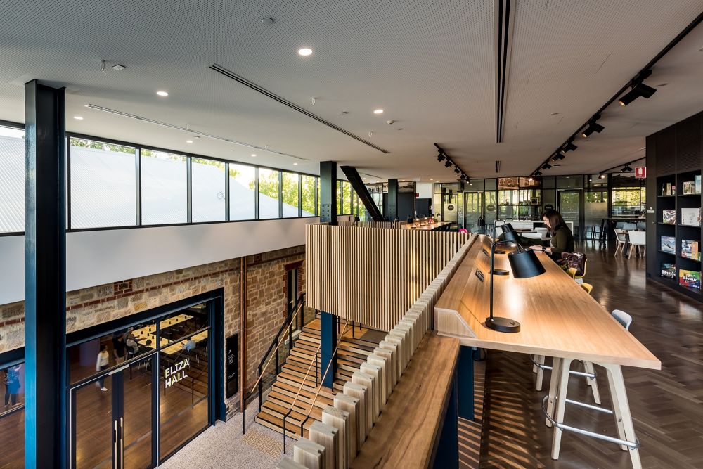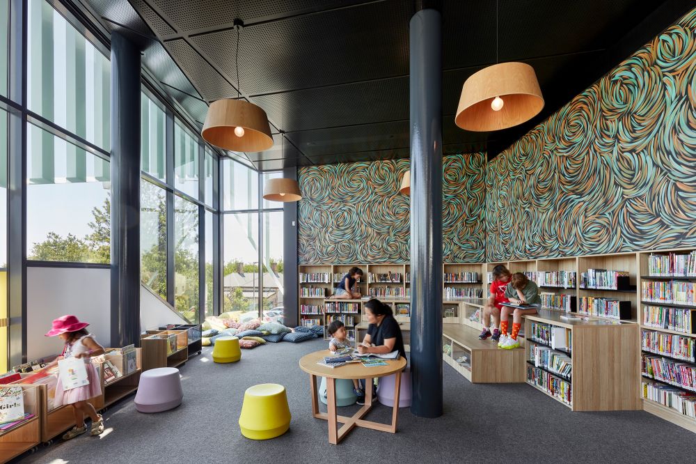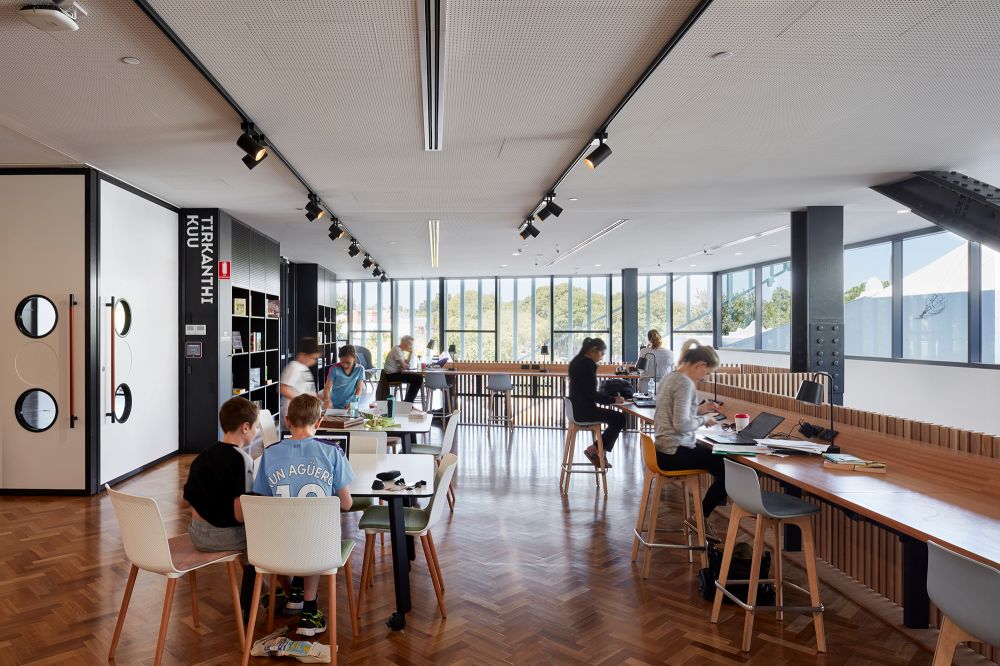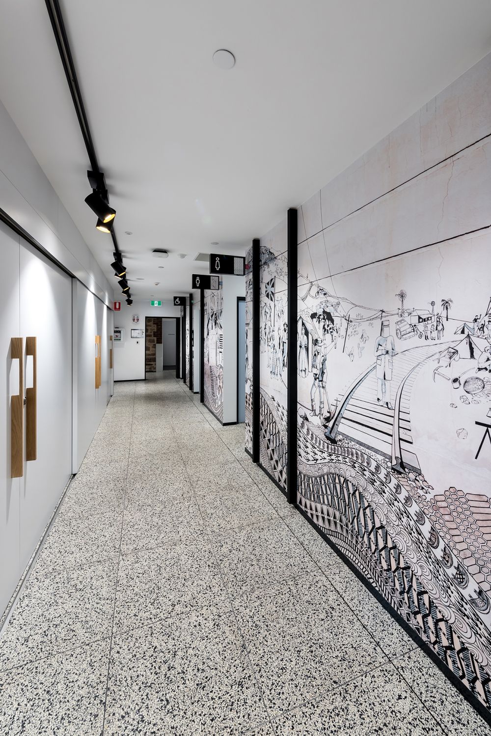 A unique proposition, Payinthi reflects councils' ambition for a bold and connected place that nods to the past and embraces the future. The interior design expresses the identity of Prospect, picking up contextual cues such as terrazzo, integrated artwork and the feature stone wall of the Town Hall which provides a backdrop to the new library space. Payinthi balances heritage materiality and craft with contemporary details and finishes that invite light into the space, creating an atmosphere that is unexpected and bold.