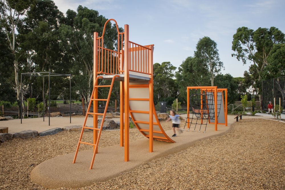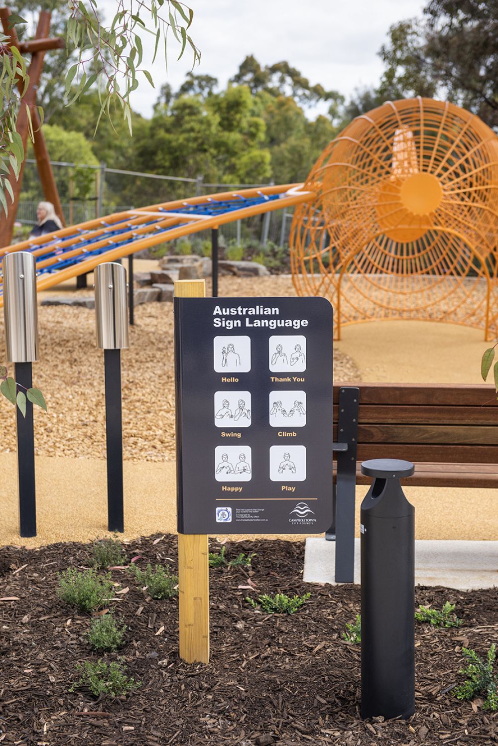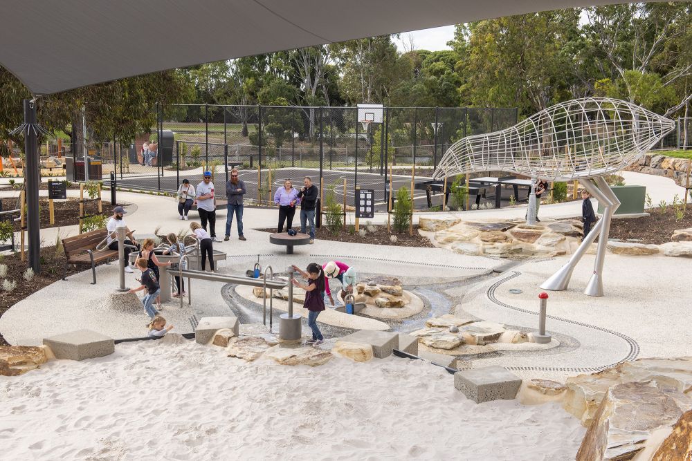 Educational features including AusLan signage and Playground Symbol Charts have also been included in the design to encourage more inclusive communication.Sustainability and bio-diversity were also key to the design with the testing and trials of emerging sustainable materials and technologies such as recycled plastic aggregate in decorative concrete paving, low heat reflective sports surfacing, and the integration of solar powered smart furniture to support wi-fi and phone charging. Bio-diversity improved throughout the park with the use of 40 different plant species and the planting of over 100 new trees which contributes to sensory benefits and improves shading.