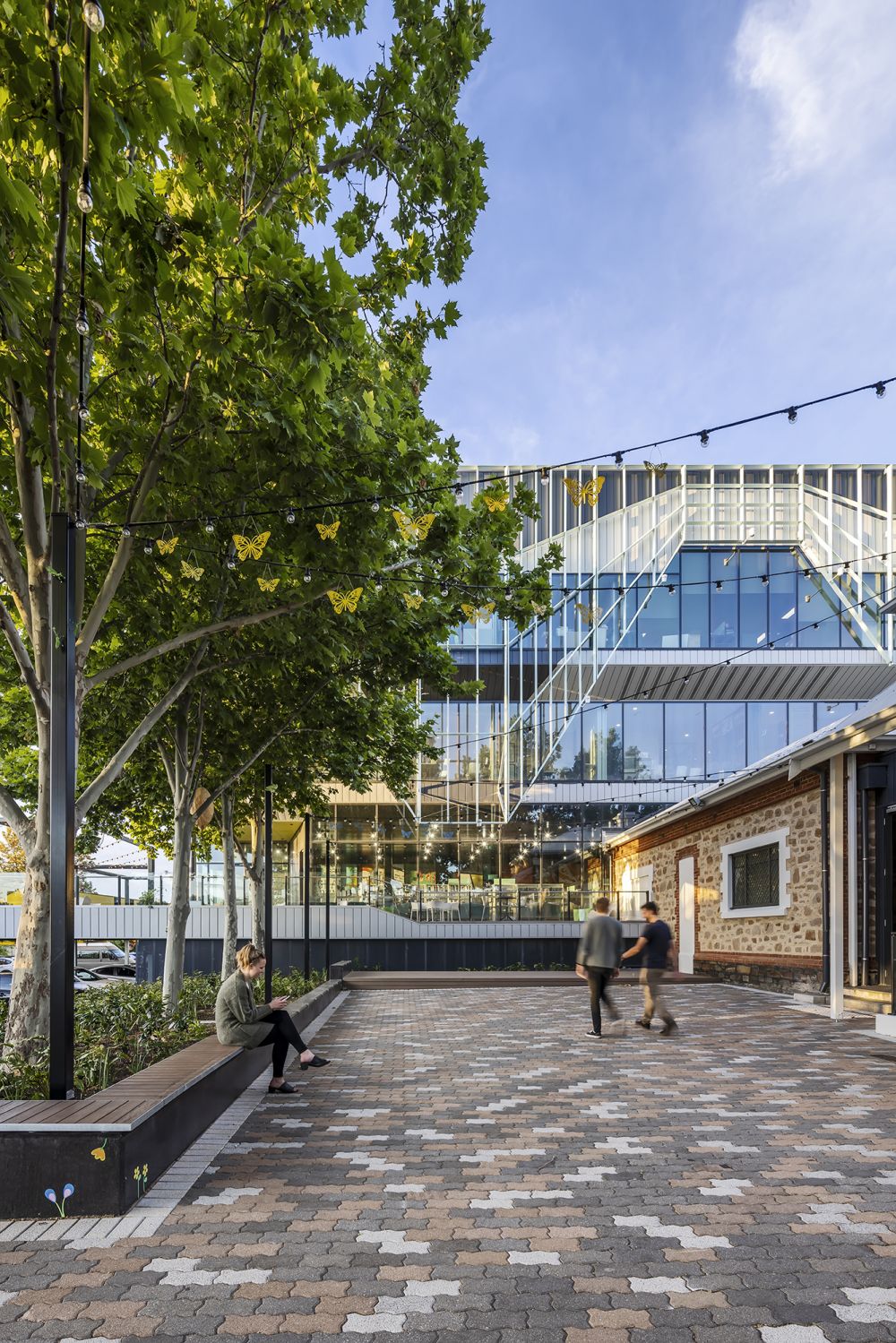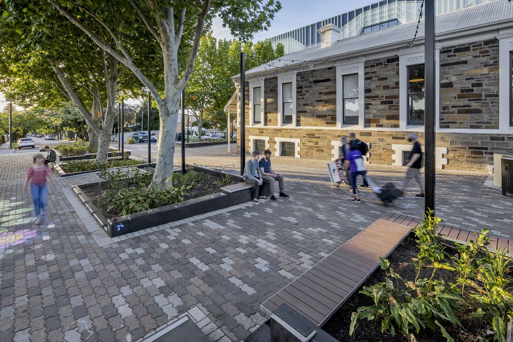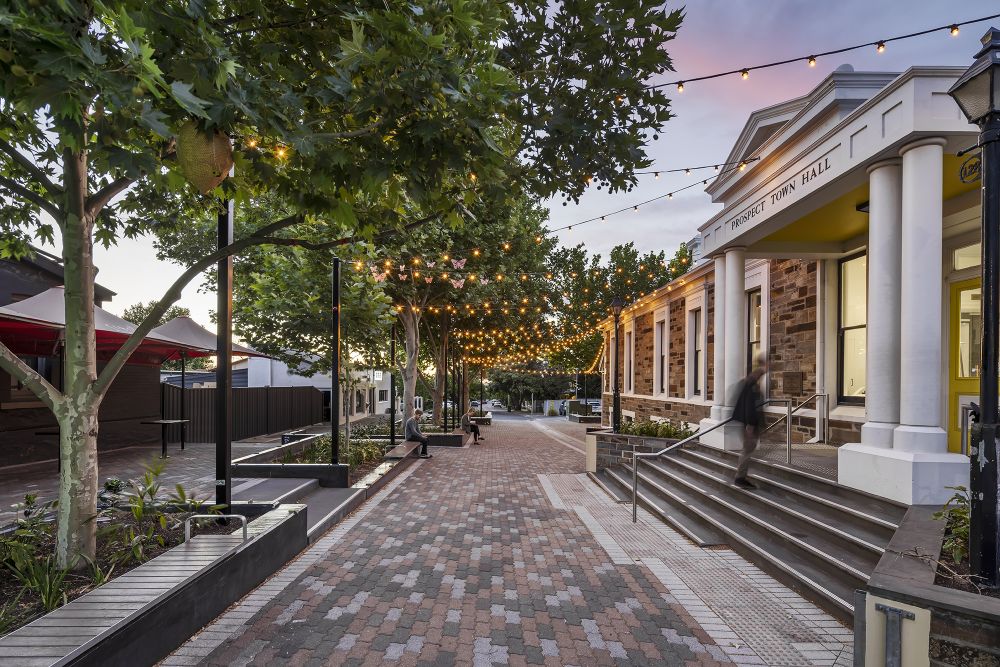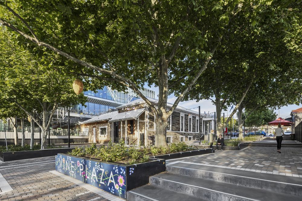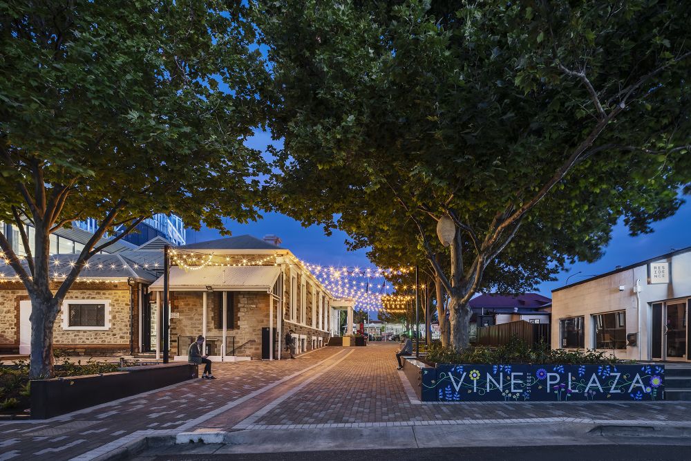 Inspired by the creative and entrepreneurial mindset of the City of Prospect, it was important for Vine Plaza to act as a blank canvas and provide opportunities for the integration of community artwork. Since opening, the community have reflected their creativity with the addition of a new mural, installations hanging from the trees and small paintings along the seating and footpaths. A key community asset for the progressive community of Prospect, Vine Plaza now provides greater opportunities and flexibility for events, markets and outdoor dining.