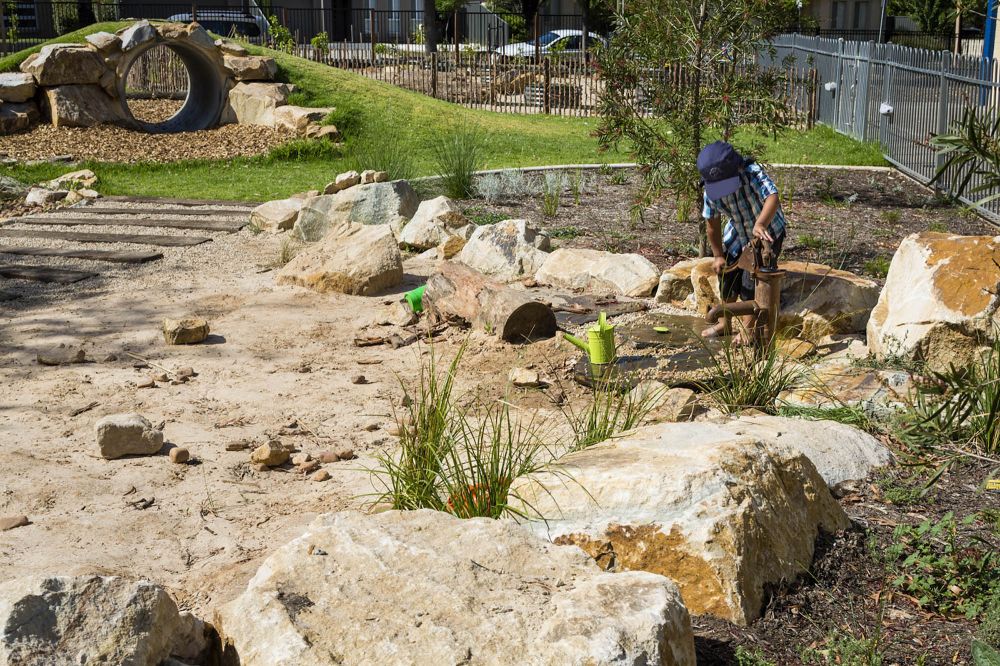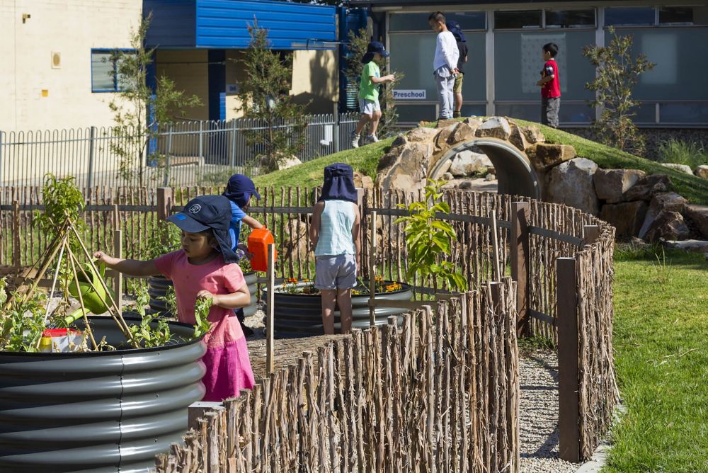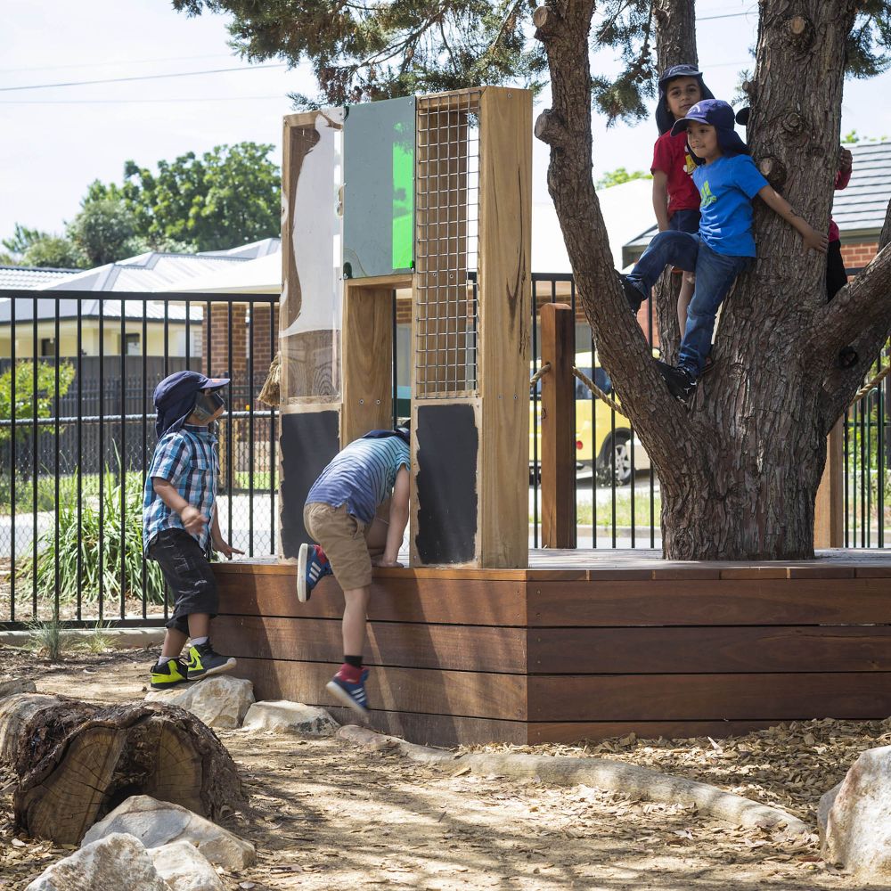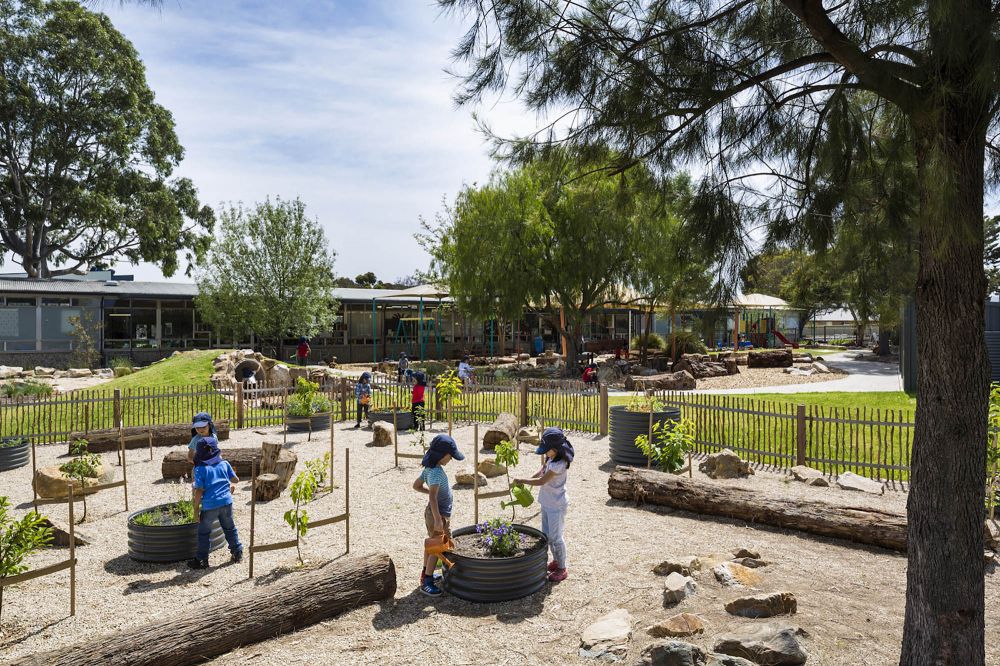 Throughout the outdoor space, language is weaved into the design to create an experience special to the Wandana Child Parent Centre. The word ‘Welcome’ has been stamped in multiple languages within the concrete path which surrounds the outdoor space, connecting each outdoor room. Children have identified with their own language, making them feel more connected with their space. Vegetable gardens, climbing trees, mud pits and an outdoor kitchen have all been incorporated into the outdoor learning area, providing spaces that connect to children from different backgrounds.