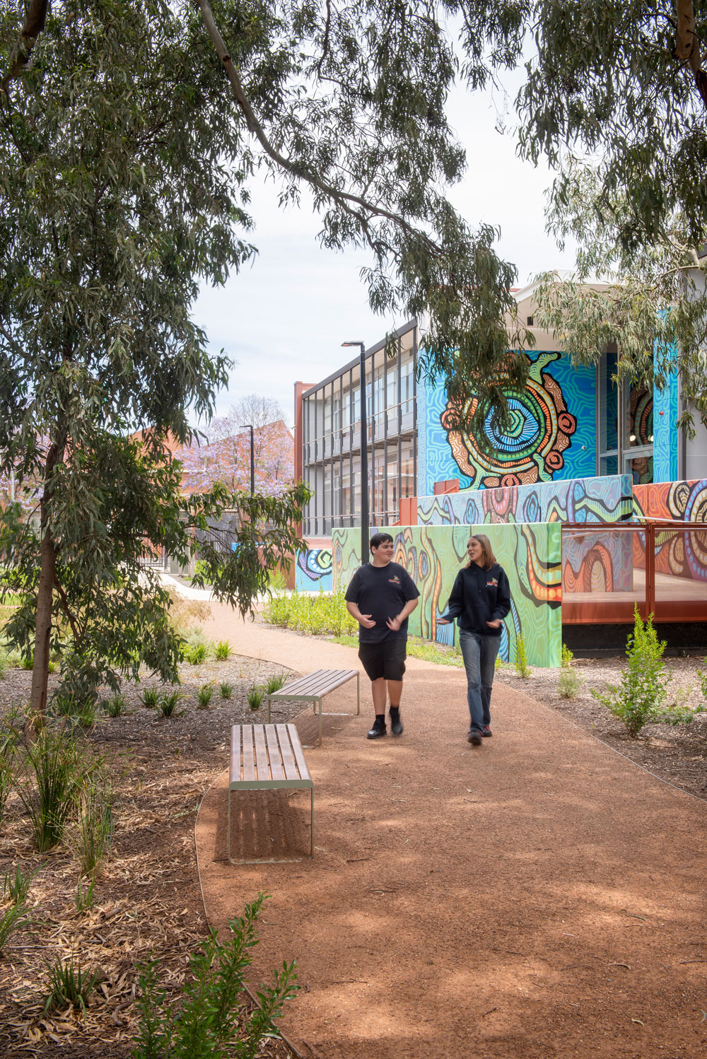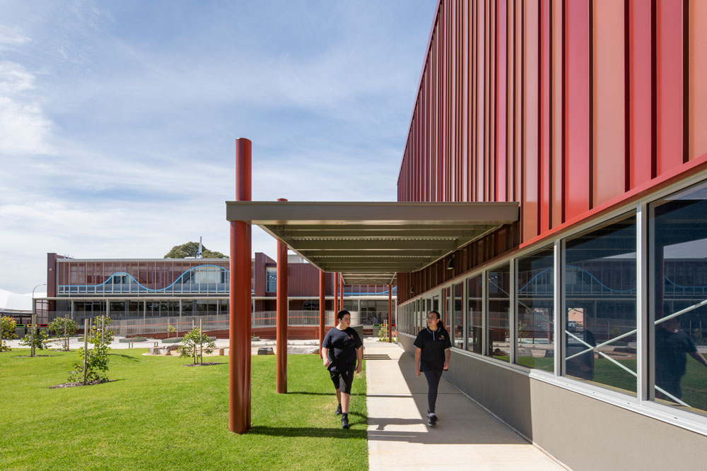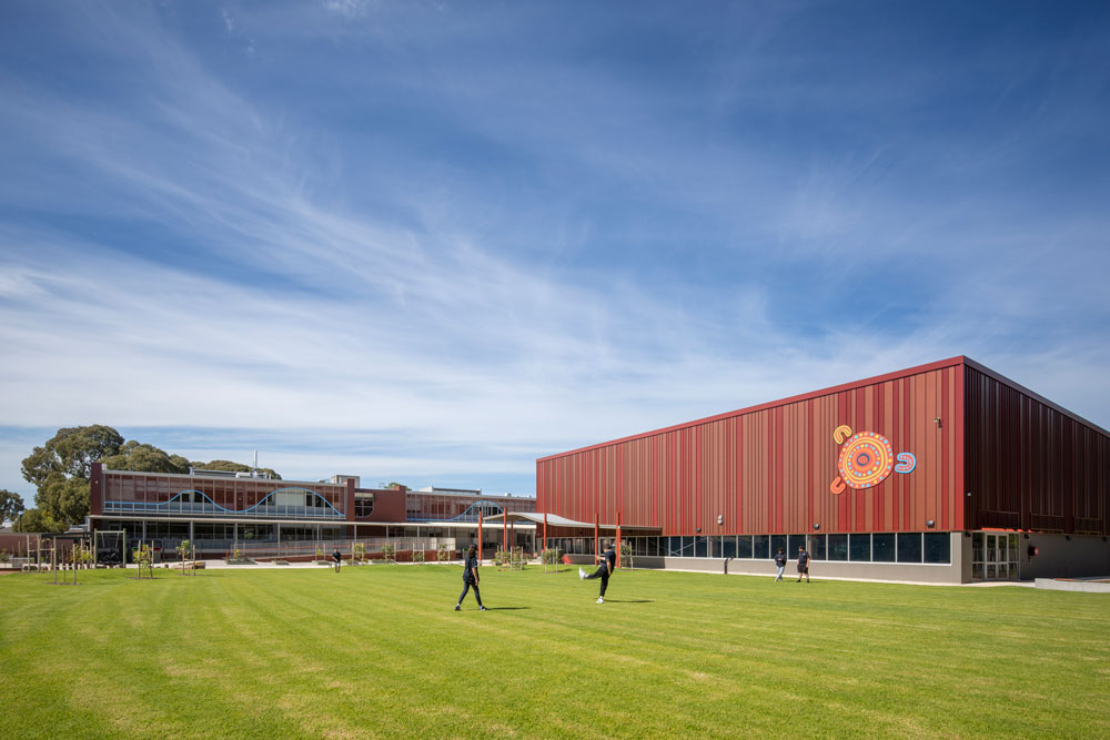 The use of colour, curves, natural textures and translucent and tactile materiality throughout the buildings and landscape provides the backdrop for the school's unique identity to shine through, with school signage and public art commissioned on key building facades.