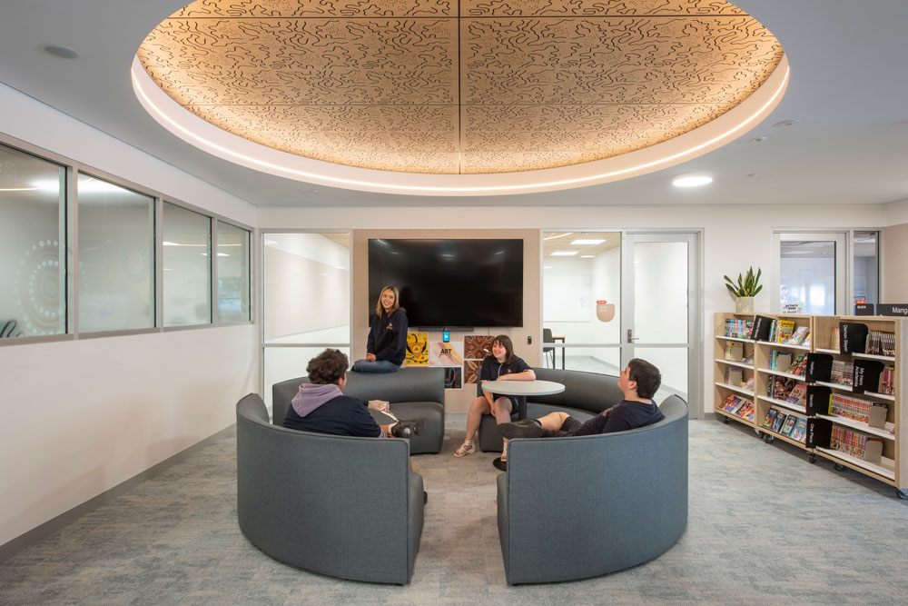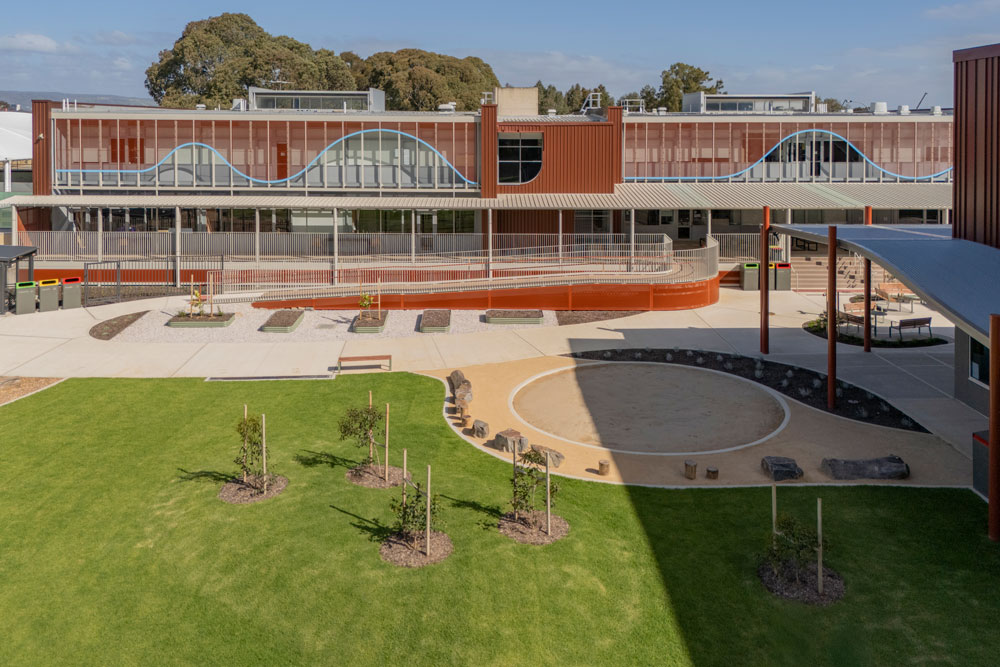Quiet pods and a dedicated Wellbeing Space offer safe, re-calibration areas to support students and a calming materials palette reduces overstimulation in the school's interior. All spaces offer either a visual or physical connection to Country with dedicated outdoor learning areas; some located under the shade of the historic eucalyptus trees. Yarning circles for sharing stories, take pride of place in both the interior and exterior learning environments.