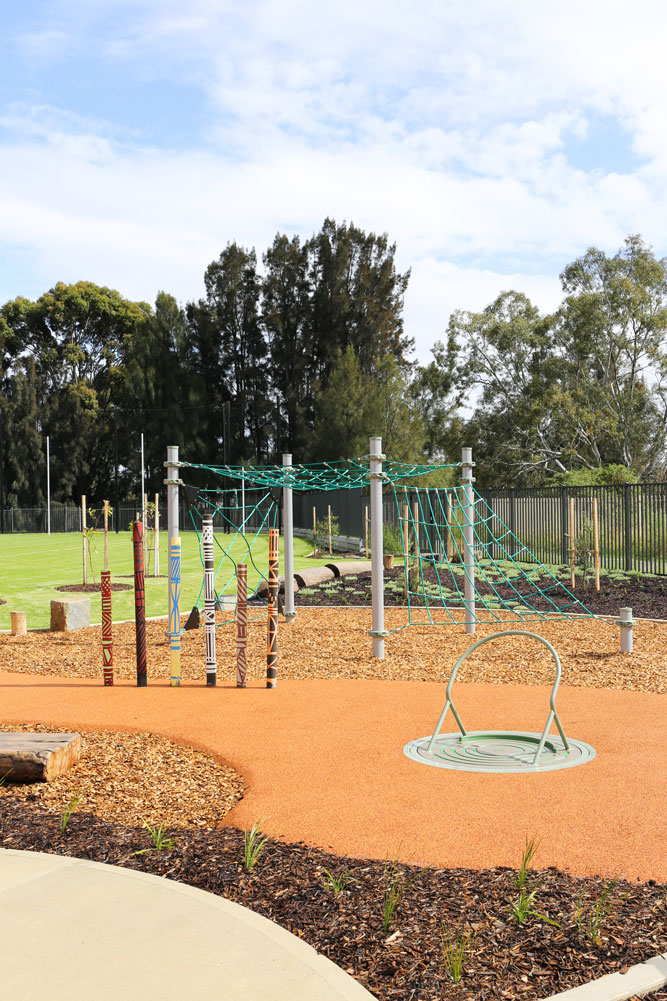 The landscape delivers meaningful outdoor learning areas directly linked to indoor spaces, including STEM and Food Technology zones, alongside inclusive play areas, retreat and social spaces for all abilities. Yarning circles of varying scales provide culturally significant gathering, reflection and performance spaces. A kitchen garden and indoor-outdoor dining area support daily shared meals and hands-on cultural learning through bush tucker cultivation. The gym and adjacent outdoor learning areas are designed to support after-hours and community use. The plaza can convert to ‘festival mode’, accommodating food trucks, temporary shade structures and seating to support larger community and whole school events and celebrations