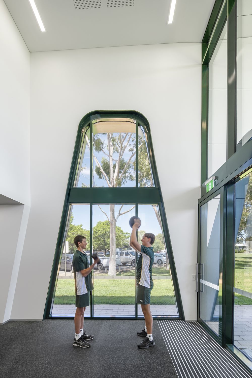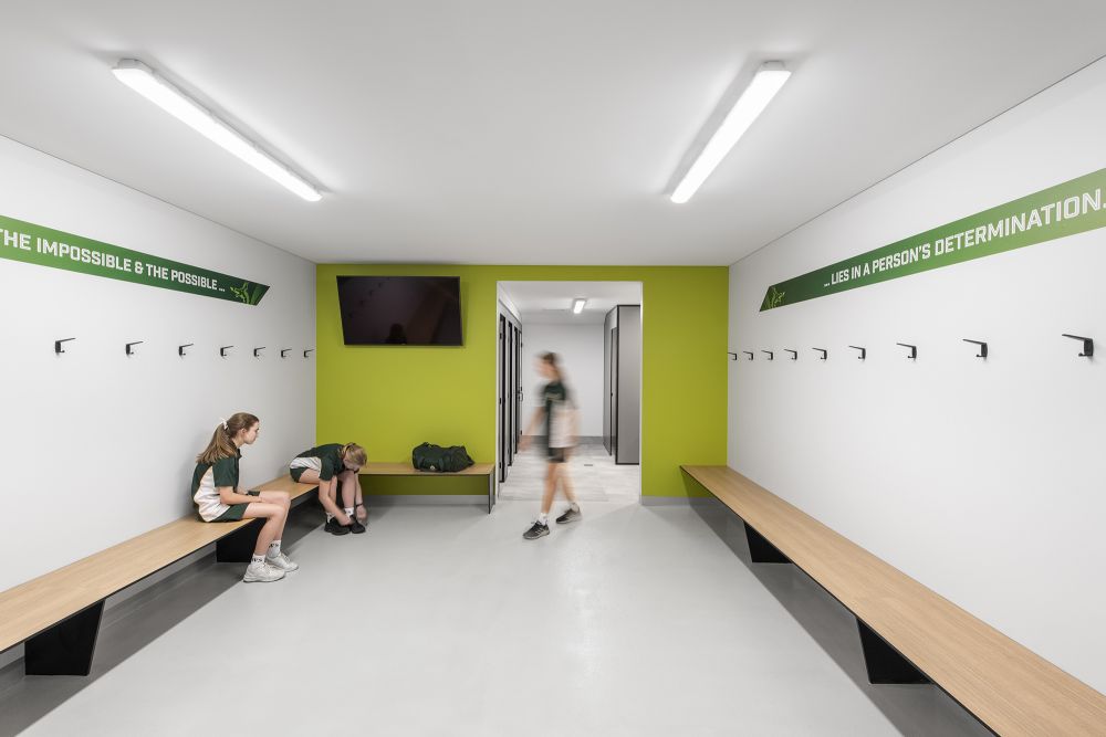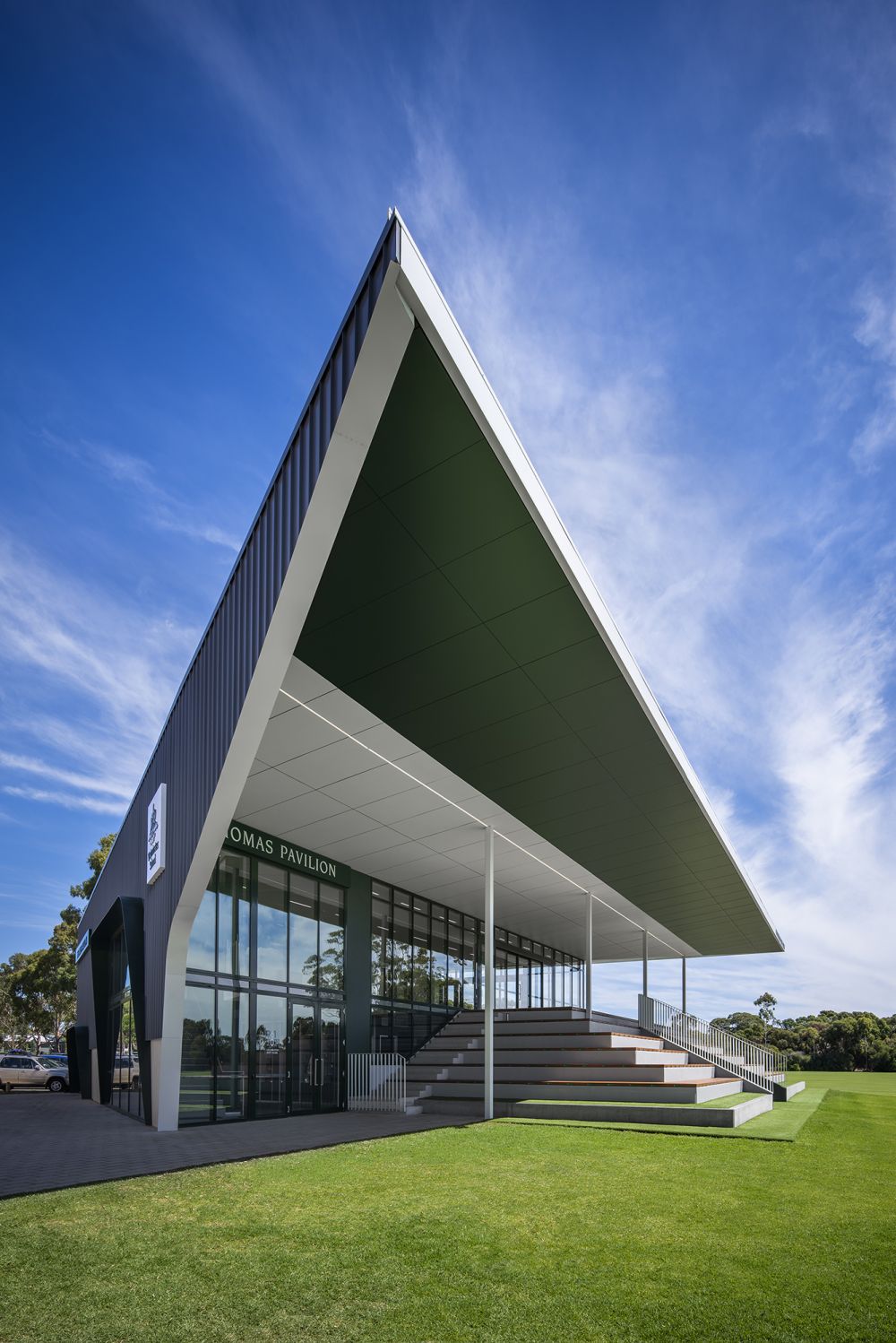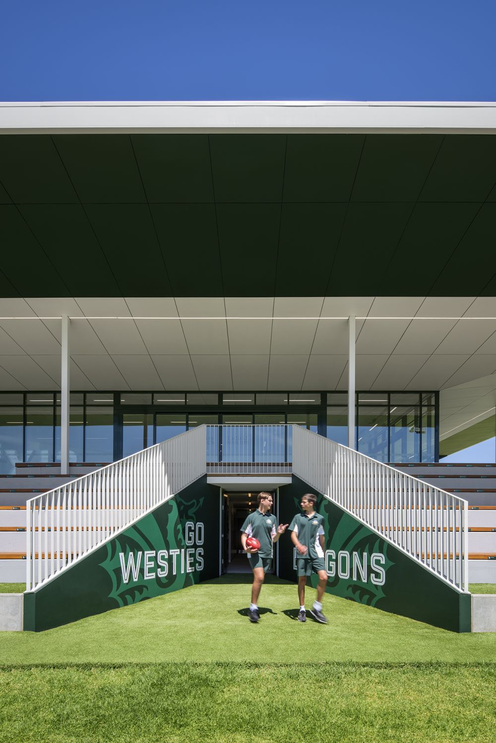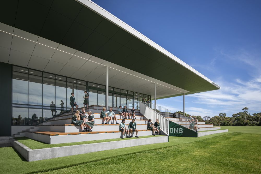 The Pavilion includes an expansive roof that stretches outwards to create a protected public verandah, sheltering the tiered seating that accommodates 300+ spectators. In terms of campus development, this facility plays a part in a larger school development to enable contemporary pedagogy that uses flexible and natural learning environments. The oval can now be percieved as a learning space. The Pavilion design responds to human movement and a culture of wellbeing and inclusivity, producing a facility that is well equipped to support the school community into the future.
