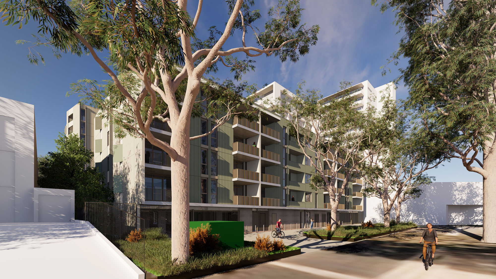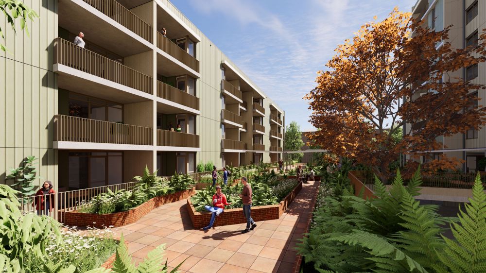 Apartments are organised into clusters around three central cores, creating vibrant “neighbourhoods” that encourage social connections and a sense of belonging. A wide, raised courtyard separates the north and south buildings, providing residents with access to edible gardens, cooking facilities and versatile spaces for meeting, relaxation, work and play, surrounded by deep soil planting as a green buffer.